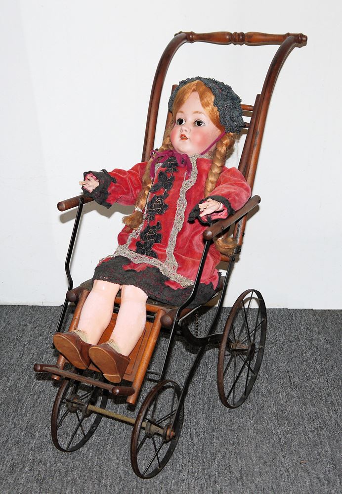 Kopf aus Bisquit mit offenem, bezahntem Mund, Schlaf- und Schelmenaugen, Echthaar unbeschnitten, Kopf gemarkt "S & C", "Made in Germany" & "68", Massekörper mit beweglichen Gliedern, Finger intakt, in Samtkleid der Zeit mit Rüschen und Häubchen, H 68 cm, dazu originaler Falt-Puppenbuggy um 1900 aus gedrechseltem Holz und Eisen, funktionsfähig und in gutem Zustand