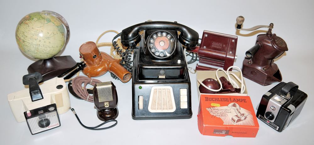 Boxkamera Kodak "Brownie Hawkee", österr. Wählscheibentelefon, Kaffeemühle "Pe-De", Neckermann Faltenbügler, Haarfön "Solis", Tischmikrofon Grundig, Gegensprechanlage "Büroton", Buchlese-Lampe "Hergil", Tischglobus, Polaroid Land Camera "Swinger", elektrische Funktionen nicht geprüft