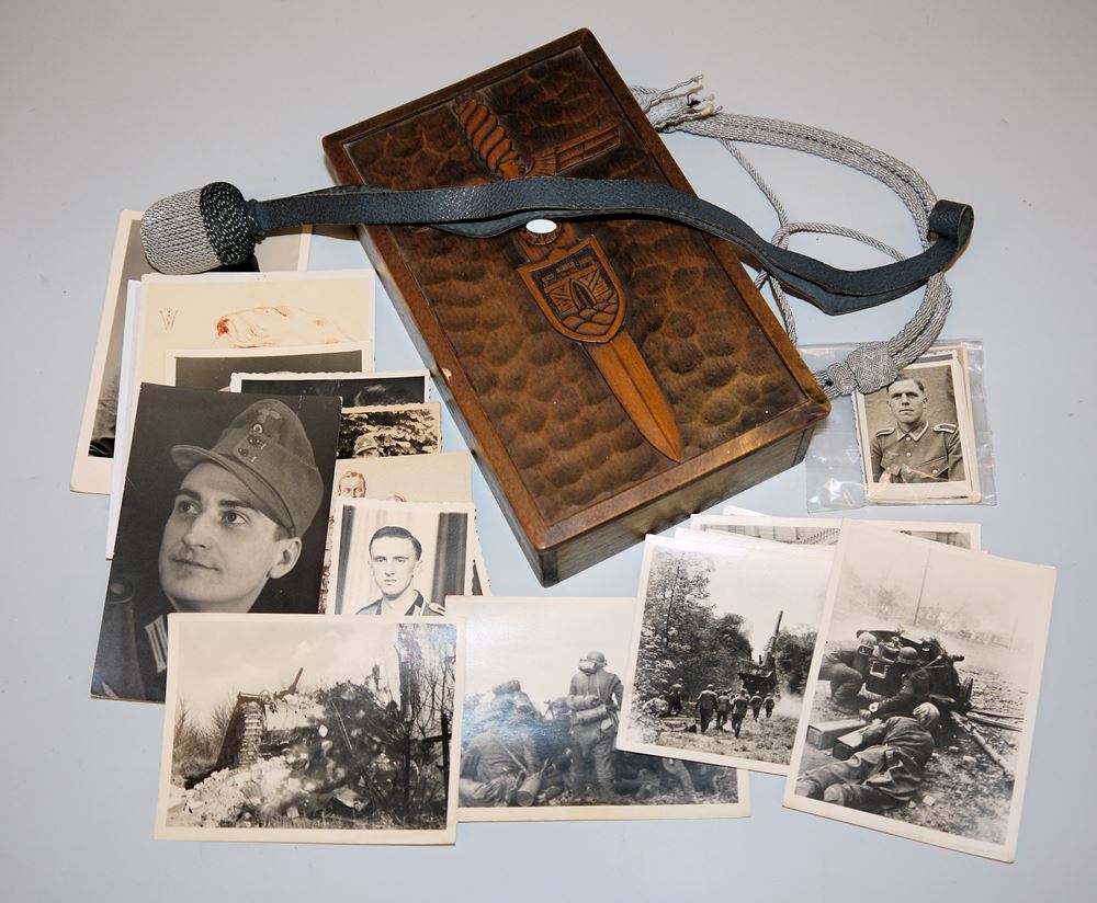 Kleiner Militaria-Nachlass mit einigen Fotografien, einem Portepee für einen Säbel in dekorative Holzkiste mit geschnitztem Truppenemblem, innen bez. Norwegen 1943