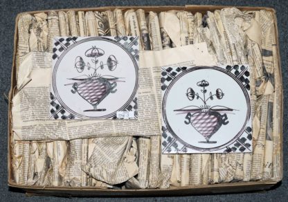 Lagerfund Delfter Fliesen des 18. Jhs. Über 50 Wandfliesen mit Dekor "Bloempotten" und vereinfachtem "Wanli"-Randmuster in Mangan-Malerei, die Fliesen wurden ausgebaut und seit 1961 (Zeitungspapier) gelagert, Einzelmaß 13 x 13 cm, daraus ergeben sich ca. 85 cm², es ist von einer soliden Lagerung auszugehen, die Fliesen werden nicht alle zur fotografischen Dokumentation ausgepackt
