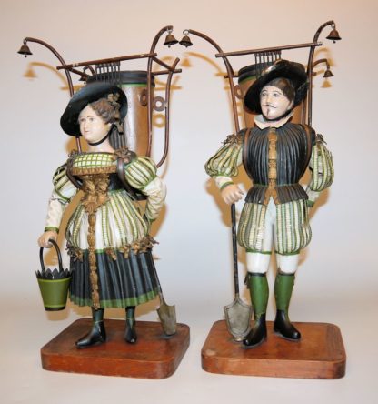 Winzerin und Winzer, zwei Schaufiguren, in frühbarocker Mode gekleidet, aufwändig gefertigt aus bemaltem Metallblech, beide tragen eine Winzerkiepe auf dem Rücken, geziert von kleinen Glöckchen (zwei Glöckchen verloren bzw. lose beiliegend), der Kopf des Mannes in Art eines Korken abnehmbar, altersbedingt kleine Beschädigungen, H 40 cm