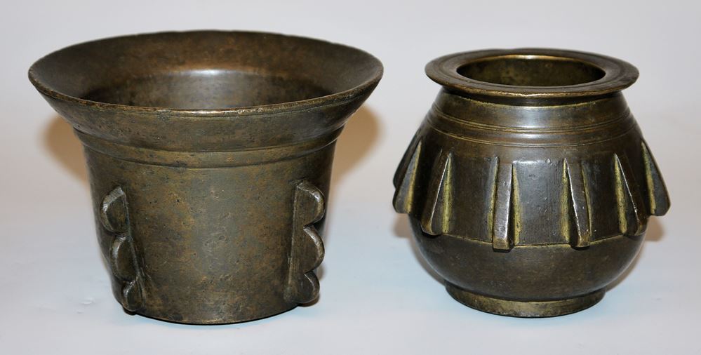 Bronzemörser in gebauchter Form mit 12 Rippen (H 8,6 cm) und Mörser mit ausgestellter Mündung und vier Rippen (H 8,5 cm)