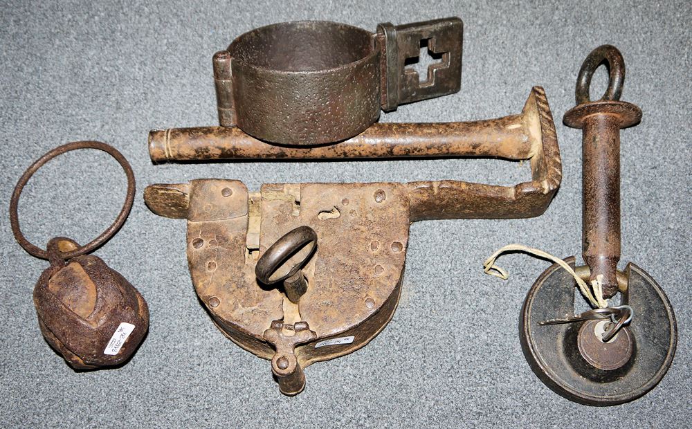 Teil eines Bolzenschlosses aus dem 17. Jh., der Verschlussriegel fehlt, der Schlüssel ist nicht gängig (B 29 cm), eine eiserne Fußfessel, Mechanismus lässt sich öffnen (10 x 18,5 cm), ein Waagengewicht aus einer alten Kanonenkugel (Dm 6 cm) sowie ein Vorhängeschloss von Rocholl in Radevormwald aus den 1930er Jahren, funktionsfähig mit zwei Schlüsseln (Dm 9,5 cm)
