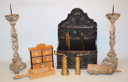 Ein Küchen-Wandhalter aus dunkler englischer Eiche (52 x 36 x 15 cm); ein Gewürzschränkchen aus heller Buche mit deutscher Beschriftung (25 x 21 x 7,5 cm), zwei barocke Altarleuchter aus Holz (H ohne Dorn 46 cm), ein alpenländischer "Wetzsteinkumpf" aus Holz (Köcher zum Feuchthalten des Wetzsteines beim Mähen mit der Sense) (L 27 cm), ein Butter-Model (L 33 cm), zwei türkische Mokkamühlen (H 18 cm) und zwei englische Federwaagen (L 22 & 25 cm)