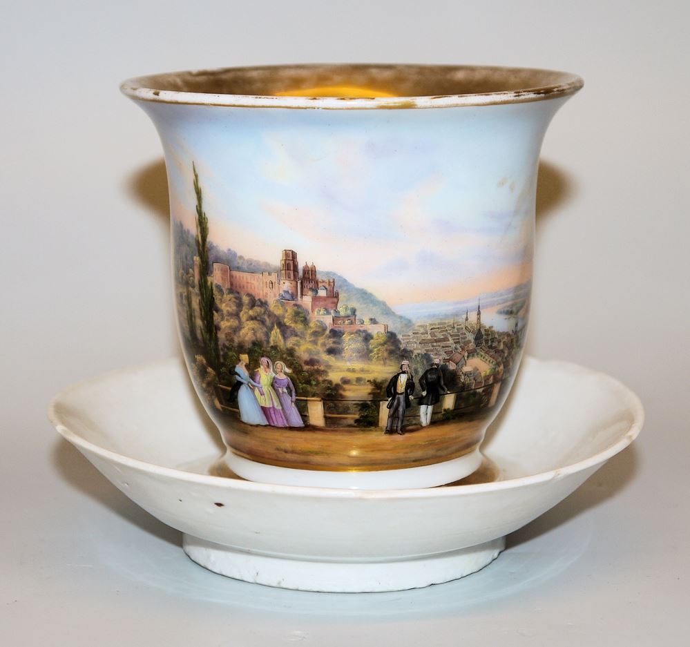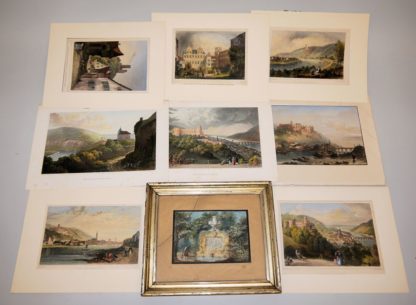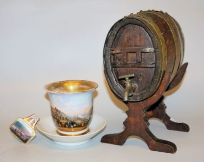 Heidelbergensia: Zwei Porzellane, eine Sammlung Aquatinta- Radierungen des 19. Jhs. und ein Modellfässschen um 1900 Große Biedermeiertasse mit Ansicht des Heidelberger Schlosses und der Stadt, ein kurzer Haarriss am Rand, Innenvergoldung berieben, ungemarkt (H 9,8 cm), ein Serviettenring aus Porzellan mit Ansicht des Schlosses von Süden, KPM Berlin mit Adlermarke 1847-49 (Dm 5,7 cm), eine Sammlung aus 17 Aquatinta Radierungen des Schlosses und der Altstadt, alle ungerahmt (ca. 3 x 13 cm bis 13 x 20 cm), dazu das Biedermeier-Aquarell eines Quellbrunnens im Schwetzinger Schlosspark (9 x 13 cm), gerahmt, Glas gerissen sowie das Schaumodell eines Küfers, ein Weinfass auf Ständer, fachmännisch gefertigt aus Dauben und Messingringen, Maße mit Ständer 25 x 19 x 14 cm
