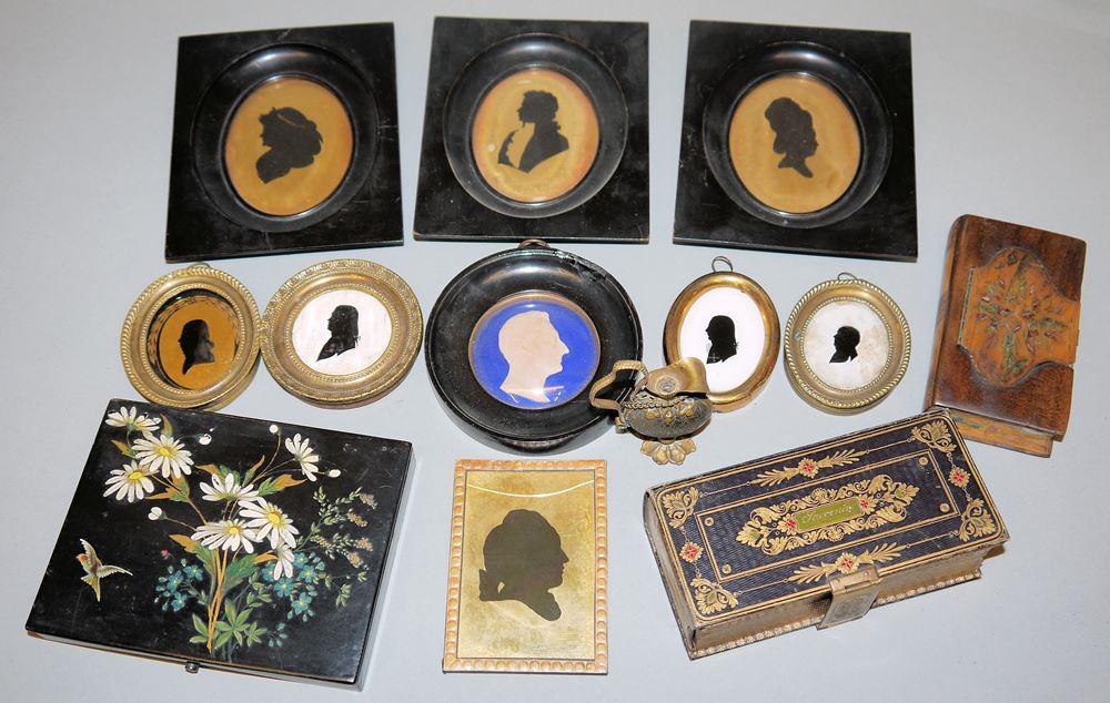 Acht Porträt-Silhouetten (4,6 x 3,6 cm bis 8,3 x 6,3 cm), ein Relief-Porträt (Dm 5,6 cm), Maße sind Bildmaße ohne Rahmen, dazu drei Andenkendosen aus Holz und Papiermaché, einmal als "Unbuch", etwas beschädigt