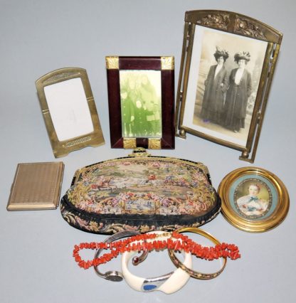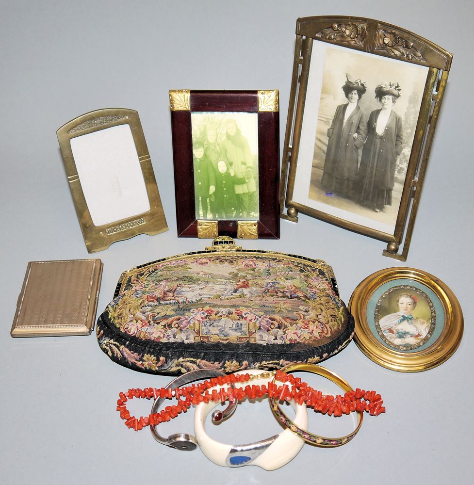 Abendtasche/Clutch aus Stoff mit Petit-Point-Stickerei, Metallbügel mit Strassbesatz, Umhängekette dabei, L 20 cm; Armreif, Knochen mit Silber und Lapislazuli; Armreif, 835er Silber mit Ammonit und Achat; Korallenkette, L 42 cm; Armreif mit Petit-Point-Stickerei; Zigarettenetui, versilbert; 3 Standrahmen des Jugendstils, Messing/ Holz mit Metallbeschlägen, 20/ 13/ 13,5 cm und Miniatur, Brustbild einer Dame des Rokoko, Feinmalerei, oval, monogrammiert, H 6,5 cm, hinter Glas im Metallrähmchen, frühes 20. Jh.