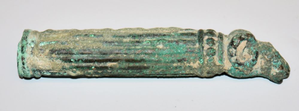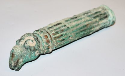 Griff einer Patera mit Widderkopf, Griff kanneliert mit Ende in Form eines Widderkopfes, Bronze mit kupfergrüner Patina, versintert, L 14,5 cm, aus alter Heidelberger Sammlung, laut Einlieferer in den 1970er Jahren erworben