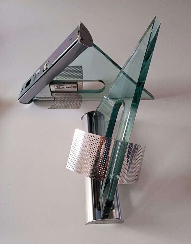 Entwurf Carlo Forcolini 1985, *1947-, italiensicher Designer, zwei "Icaro", moderne Appliken, revolutionär in der Formensprache und hochwertig im Material, das Glaselement lenkt und bricht das Licht, der Reflektor verhindert die Blendung, Icaro werden nicht mehr produziert und sind entsprechend selten, hier beide Leuchten noch originalverpackt in Kartons, das Foto ist ein Beispielbild, 26 x 28 x 17 cm
