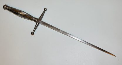 Vierkantige Stoßklinge, zweiseitig punzierte Schmiedemarke mit S, der eiserne Balustergriff und die waagrechten Parierstangen spiralig geschnitten, Griff und Ansatz zusätzlich tauschiert, gute Schmiedearbeit, L 33,8 cm