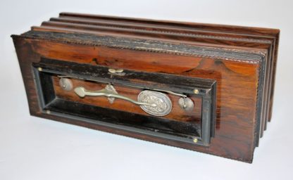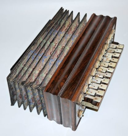Diatonisches Akkordeon aus Palisander mit Perlmuttknöpfen in zwei Reihen, zwei Bassknöpfe, Balg intakt, in schönem Zustand und spielfähig, Hersteller-Prägestempel auf dem Gehäuse, 18 x 36 x 14,5 cm