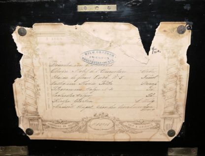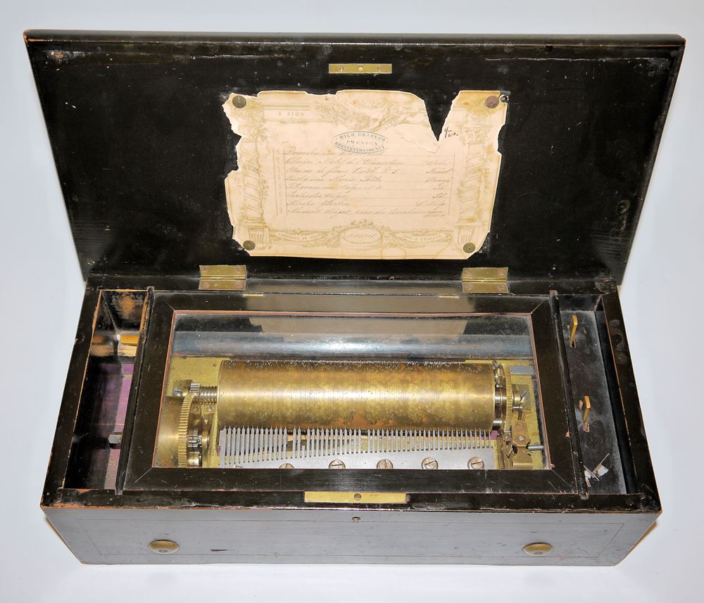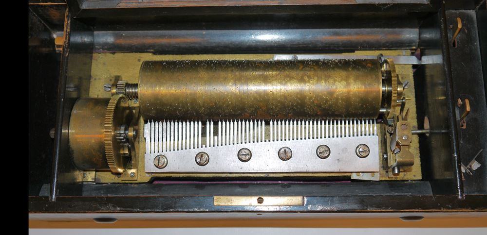 Schweizer Walzenspieldose, vertrieben von Wilhelm Gräbner, Dresden um 1890 Funktionsfähige Spieldose mit 8 Liedern, im Deckel in französischer Sprache beschriftet und Stempel des Musikalienhändlers, Kamm mit 58 Zungen (8 Zungenspitzen gebrochen, 3 Zungen gebrochen), Federwerk mit Hebelaufzug und Stellhebel intakt, in Edelholzkasten mit Glasabdeckung, Gebrauchsspuren, 13,5 x 42,5 x 20,5 cm