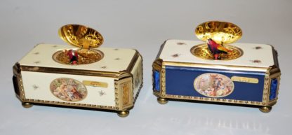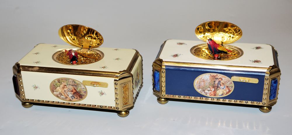 Zwei gleiche Singvogel-Dosen in Form von barocken Tabatieren, ein Klappdeckel mit Schäferszene öffnet sich und zeigt den zwitschernden und flügelschlagenden Singvogel, Federaufzug intakt, die Mechanik des Spieles läuft, das vollständige Aufrichten des Vogels und die Abschaltautomatik nur zum Teil funktionstüchtig, wohl durch unsachgemäße Handhabung, optisch sind beide Dosen in gutem Zustand, es fehlt ein Glasstein an einer geschrägten Ecke und es gibt nur einen wechselbaren Aufziehschlüssel für beide Federwerke, beide auf Boden gemarkt "Made in West Germany", 5 x 11 x 6,5 cm