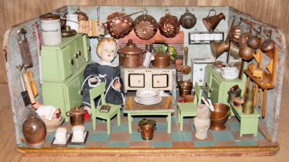 Liebevoll gewachsene Puppenküche mit Herd, Mobiliar, Kupfergeschirr und reichlich weiterem originellem Küchenzubehör, dazu zwei Stubenpuppen und eine größere Massepuppe, 29 x 60 x 39 cm
