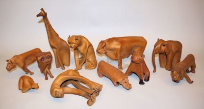 Elf Tiere aus gefaltetem Leder: Elefant, Giraffe, Stier, Löwe und Löwin, Affe, Flusspferd, Bär, Eisbär, Boxer und Eule, mit Brandmarke bezeichnet, z.T. etwas bespielt (Stier fällt um), H 6 - 28 cm