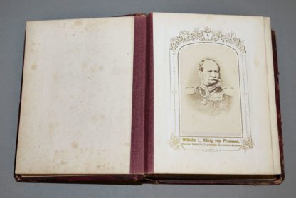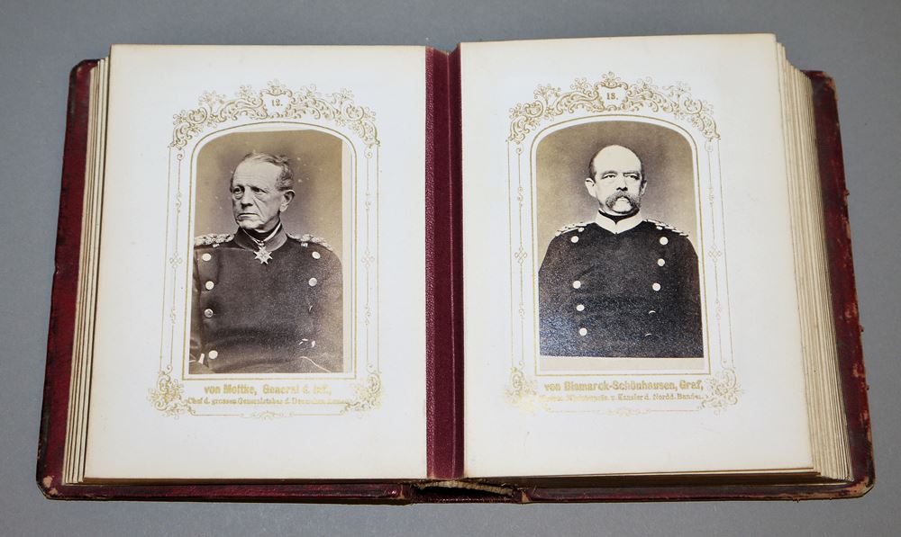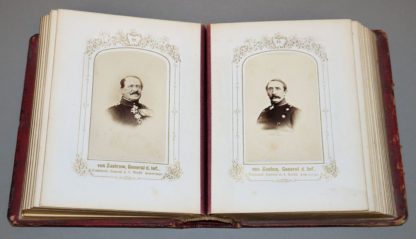 Ganzleder-Ausgabe mit reicher Goldprägung, altersbedingt stellenweise beschabt, Kartonblätter mit Goldschnitt, 25 Seiten mit 49 von 50 montierten Original-Fotografien preußischer Militärs, deutscher Fürsten und Politiker, es fehlt lediglich das Bild des Kronprinzen Friedrich Wilhelm (später der 99-Tage Kaiser Friedrich III.), sehr selten mit den (fast) vollständigen Portraits und in gutem Zustand, 16 x 13 x 5 cm