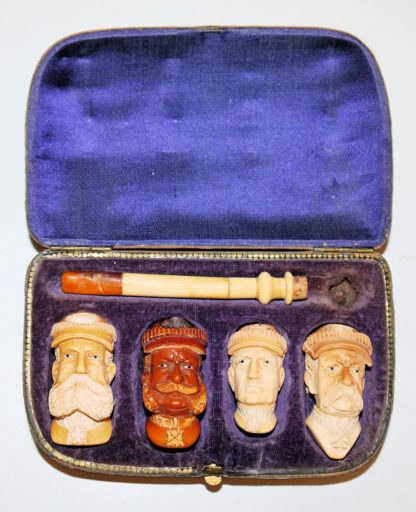 Vier Meerschaum-Pfeifenköpfe in Form der gekrönten Häupter von Kaiser Wilhelm I., Kaiser Franz-Joseph, Wilhelm II. und Fürst Bismarck, alle mit Pickelhauben (H ca. 4,5-5 cm), zusammen mit Mundstück in Originalschatulle