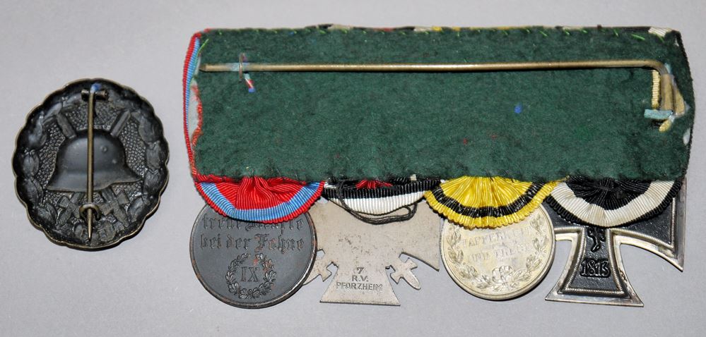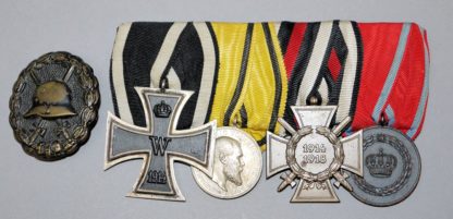 Ordensspange mit vier Auszeichnungen, EK 2, Medaille für Tapferkeit und Treue, Kriegsteilnehmerkreuz, Dienstzeitmedaille für 9 Jahre Württemberg, dazu Verwundetenabzeichen in Schwarz WK I, guter Zustand