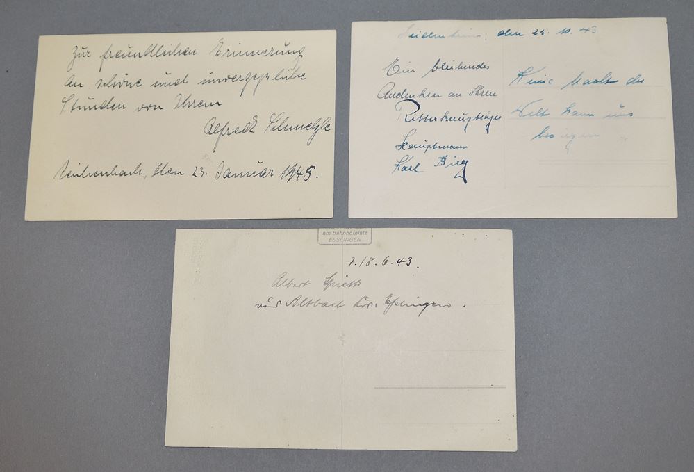 2x Wilhelm Roth (Photohaus Claus, Esslingen), Karl Bieg (Heidenheim 1943) und Albert Spieth (1943), dazu Träger des Deutschen Kreuzes in Gold Alfred Schmelzle, (signiert 1944), alle 9x13, guter originaler Sammlerzustand