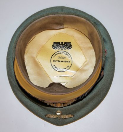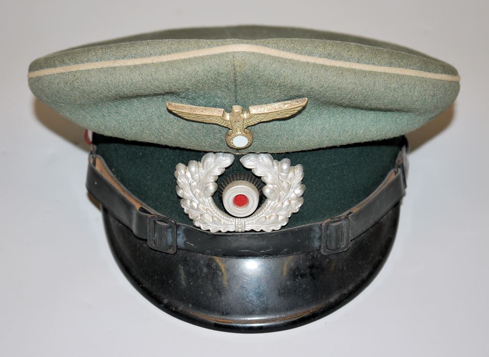 Eigentumsstück aus feldgrauem Wolltuch, dunkelgrüner Besatzstreifen, weiße Vorstöße, gelbes Seidenfutter, Mützentrapez mit Etikett von Vögele, Schweißleder, Mützenschirm aus Vulkanfiber, versilberte Aluminium-Kokarde u. Buntmetall-Adler, lederner Mannschaftsriemen, Deckel mit leichter Mottenaufrauhung, getragener Zustand