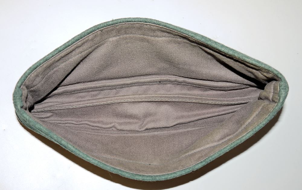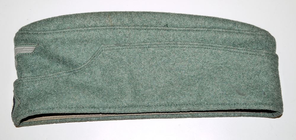 Feldmütze M38 "Schiffchen" für Mannschaften Eigentumsstück aus feldgrauem Wolltuch, braunes Innenfutter, BeVo-gewebte, maschinell vernähte Effekten, leichte Trage- und Altersspuren, minimale Mottenspuren, aus Nachlass wie vor