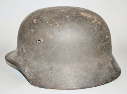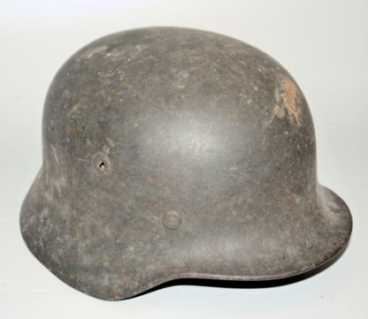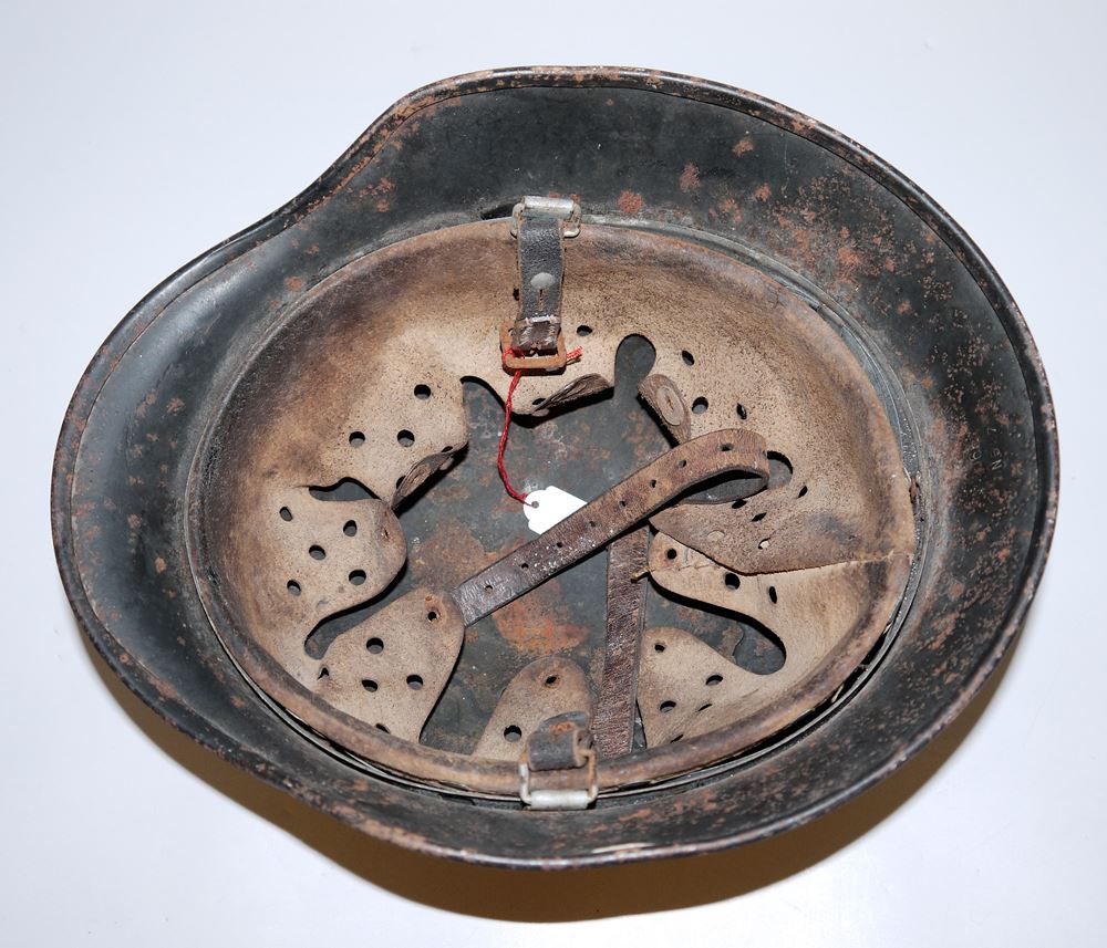 Stahlhelm mit feldgrauer Originallackierung, gestanztes Lüftungsloch, Ausführung ohne Helmembleme, komplett mit originalem Innenfutter, Glocke im Nacken gestempelt "Q66 DN527", Kinnriemen mit RB (Reichsbetriebsnummer), Helm im ungereinigtem, originalem und seltenem Fundzustand, mit Tragespuren, leichter Farbverlust und Flugrost