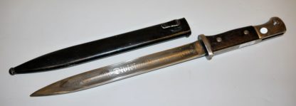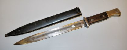 Originales Bajonett des WK2 mit Scheide, alle Teile mit eingeschlagenen Kammernummern, die Ätzungen der Klinge und der Griffes sekundär, Ges.-L 40,5 cm