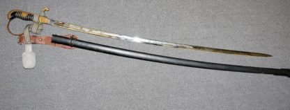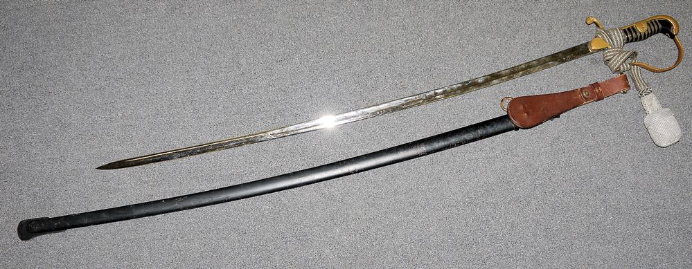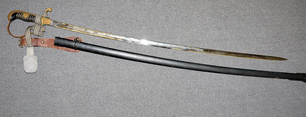 Offizierssäbel mit leicht geschwungener Klinge, Messingbügelgefäß mit Ziergravuren, Parierlappen mit Hoheitsadler, Kunststoffgriff mit drei leichten Abplatzungen, mit Originalportepee, schwarze Stahlscheide mit einem Tragering, mit Koppeltragegestell, L 94 cm