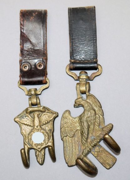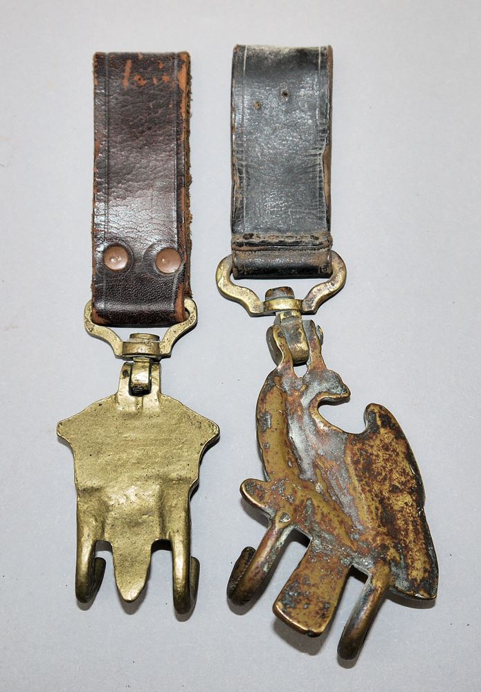 Trommelhaken SA (oder Partei) aus Messing mit Hoheitsadler, mit braunem, originalem Tagehänger aus Leder, L 9 cm; schwerer Trommelhaken der Wehrmacht mit Adler ohne Krone, L 11 cm, mit starkem, originalem Lederhänger, leichte Altersspuren