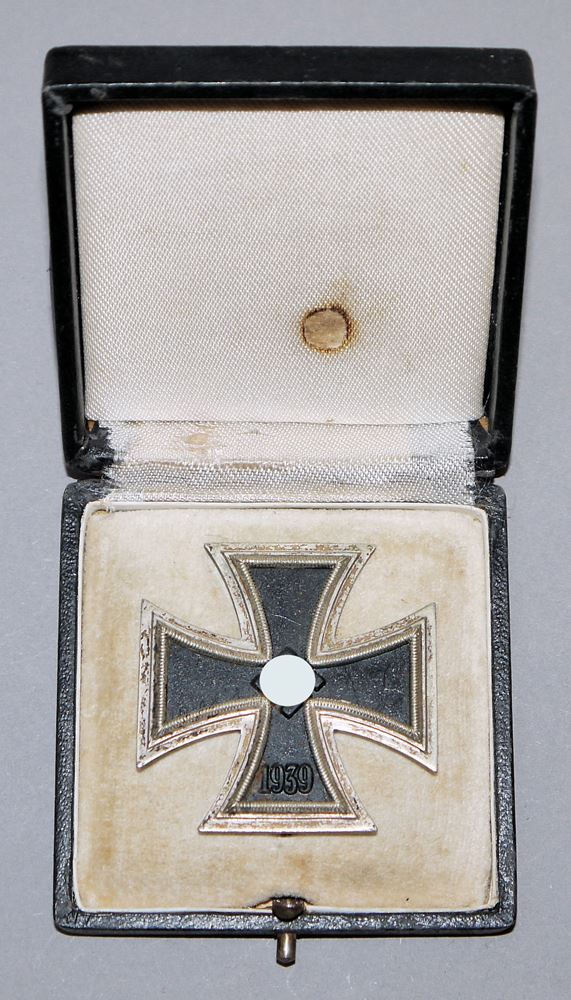 Eisernes Kreuz 1. Klasse 1939, mit Etui EK 1. Klasse 1939, magnetisch, Nadel magnetisch, ohne Hersteller, ungereinigter Zustand mit Alterspatina, im originalen Etui, Innendeckel mit Hersteller "KB.621", Innenfutter beschädigt, Klappetui mit Silberaufdruck