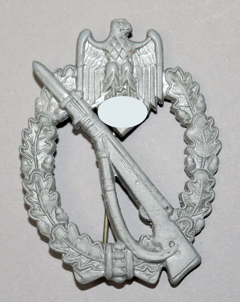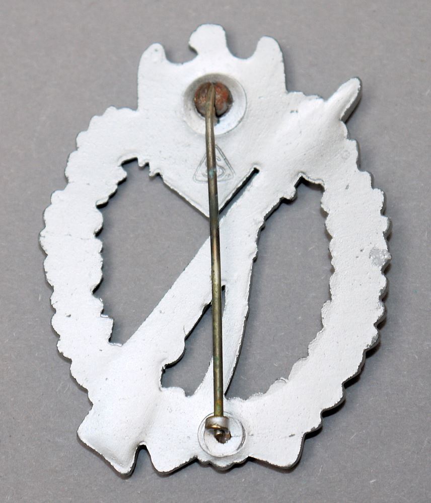 Infanterie-Sturmabzeichen in Silber, Zink versilbert, Versilberung verblasst, leicht gewölbt, Herstellerstempel "AS" im Dreieck, Adolf Scholze Gablonz, Nadel mit Kugelsystem