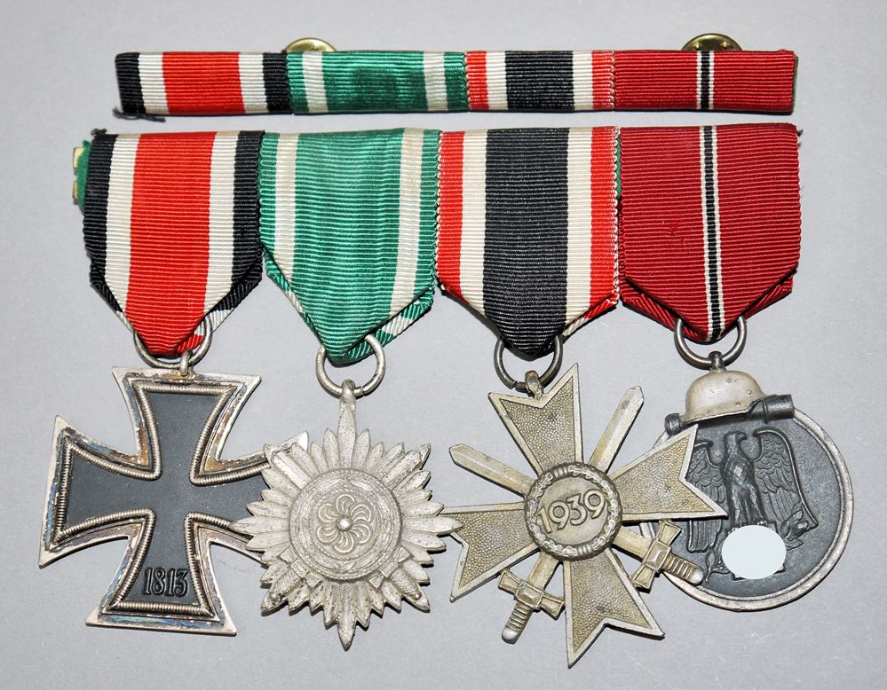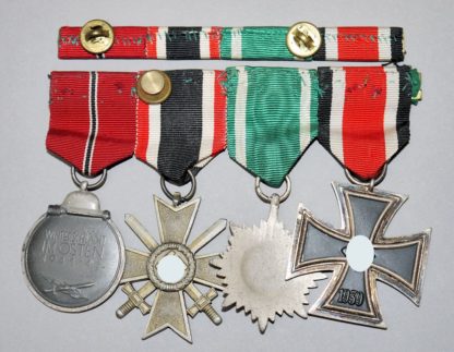 Ordensspange mit vier Auszeichnungen, Eiserenes Kreuz 2. Klasse 1939; Tapferkeitsauszeichnung der Ostvölker, 2. Klasse, Zink versilbert; KVK 2.; Ostmedaille; mit dazugehöriger Feldspange, Spangen vom Träger in den 50iger Jahren zusammengebaut