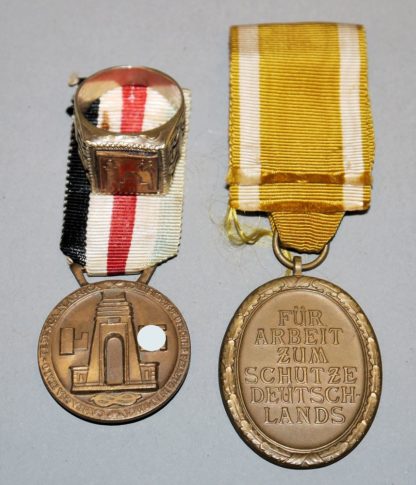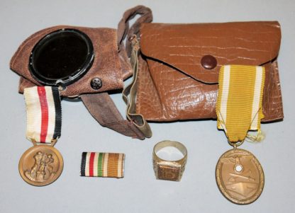 Vierteiliger Nachlass mit Feldzugsmedaille Italien, Schutzwall-Ehrenzeichen, dazugehörige zweiteilige Feldspange; Schutzbrille mit Etui; dazu Andenkenring aus Afrika
