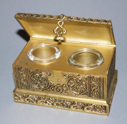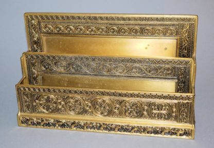 Schreibzeug, Bronze, vergoldet, feiner Reliefdekor, 10tlg., bestehend aus: Schreibunterlage aus Wildleder, eingefasst in Bronze; doppeltes Tintenfass mit Glaseinsätzen in Deckelbehälter; Schreibablage; Löschwippe; Briefmarken-Schatulle; Kalender im Standrahmen; Brieföffner; Lupe und Wochen-Abrisskalender 1913 als Schreibblock, unbenutzt, Modell-Nr. 1642, guter Zustand